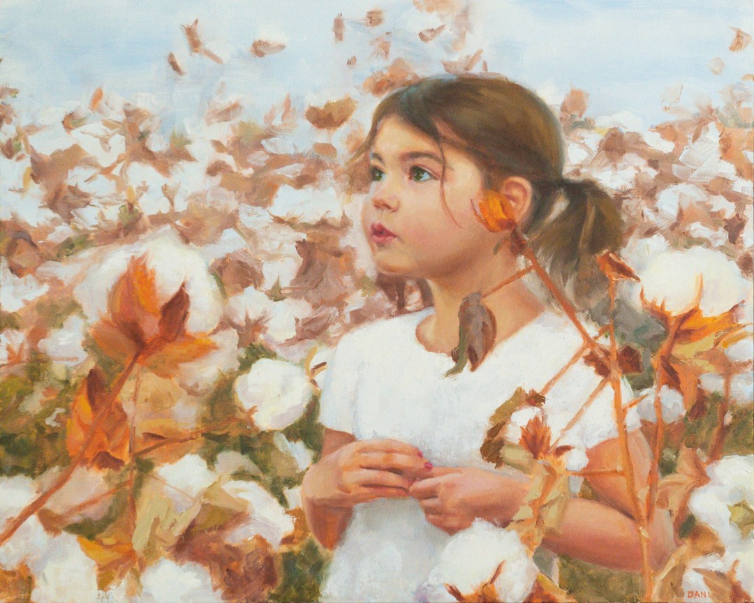 "I was first struck by the abstract and well-balanced design of this painting. It is at the same time both freely and perfectly painted. The darling girl's face is a wonderful example of how subtly the form can be turned when the artist has the skills and understanding. Magnificently incorporated are the cotton bolls which echo the colors used in the skin tones and allow the artist to lose edges. This places the girl into the scene, rather than having her feel pasted on top of it."