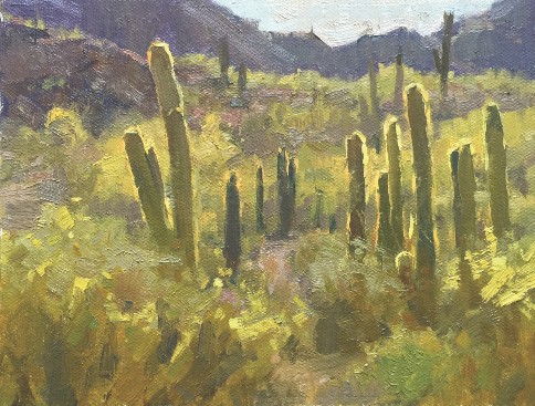 As he learned more about himself and the creative process, Marshall acknowledged that plein air was his first and strongest love as an artist. "I know I will always be a plein air painter," he says emphatically. "It fulfills my need to have a private space and a solitary pursuit in the midst of the challenges of daily living. I certainly enjoy working in the studio, but outdoor painting is an important way to be present in the moment and to respond to what I see and feel in nature. | — advertisement — |  |  | Chuck Marshall, "Back Light Cactus," 2016, oil, 6 x 8 in. Collection the artist, Plein air | "I often use my plein air pieces as resources for studio work, but when I have more time to think and plan, I gravitate toward larger figurative paintings. The largest painting I have done outside was 36 x 48 inches, but I've gone way beyond that in the studio, with the only limitation being the ability to get large panels or canvases in and out of the room. I've been working on a commission to paint a series of religious images, with the largest, of a crucifixion, being 4 x 6 feet.