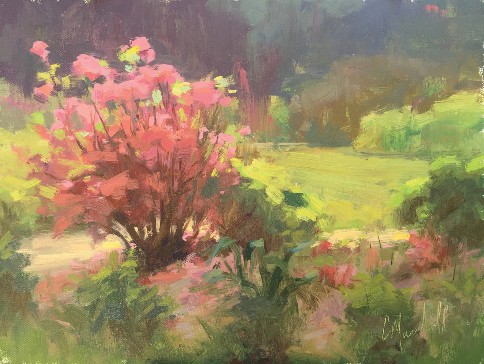 |  | Chuck Marshall, "Azaleas," 2015, oil, 9 x 12 in. Collection the artist, Plein air | While living in California, Marshall was within walking distance of the California Art Institute in Westlake Village, and he was able to take classes in drawing and painting around the time Jeremy Lipking and other promising young artists were also studying at the CAI. In addition to taking evening and weekend courses, Marshall carved out time to participate in a workshop with Skip Whitcomb. That left him "amazed at what Skip was doing as a painter and a full-time artist," Marshall recalls. "I knew immediately that was what I wanted to achieve."
