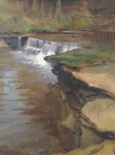After moving back to Ohio, Marshall had more time for his own studio artwork in part of the space he rented for his illustration business. He says, "I finally had a space I could dedicate to fine art painting, and I had time to get outdoors. That was a challenging time in my personal life, so going outside to focus exclusively on plein air painting was very beneficial. I needed the distraction of painting from daybreak till dark, and I benefited from thinking about improving my ability to work outdoors." |  | Chuck Marshall, "Ohio Waterfall," 2015, oil, 20 x 16 in. Private collection, Plein air | | | | Marshall maintained a friendship with Whitcomb and called the Colorado artist when he had questions about painting. For example, when he wanted advice about dealing with all the greens in the Ohio landscape, he gave Whitcomb a call. "He advised me to stick with small 6 x 8 and 8 x 10-inch panels," Marshall says. "That exercise had a tremendous positive impact on my understanding of art. Another activity that began about that time was teaching workshops. I had to define and redefine what I was doing so I could offer clear, helpful advice, and that helped me approach my own painting with a sharper focus and a more thoughtful plan."