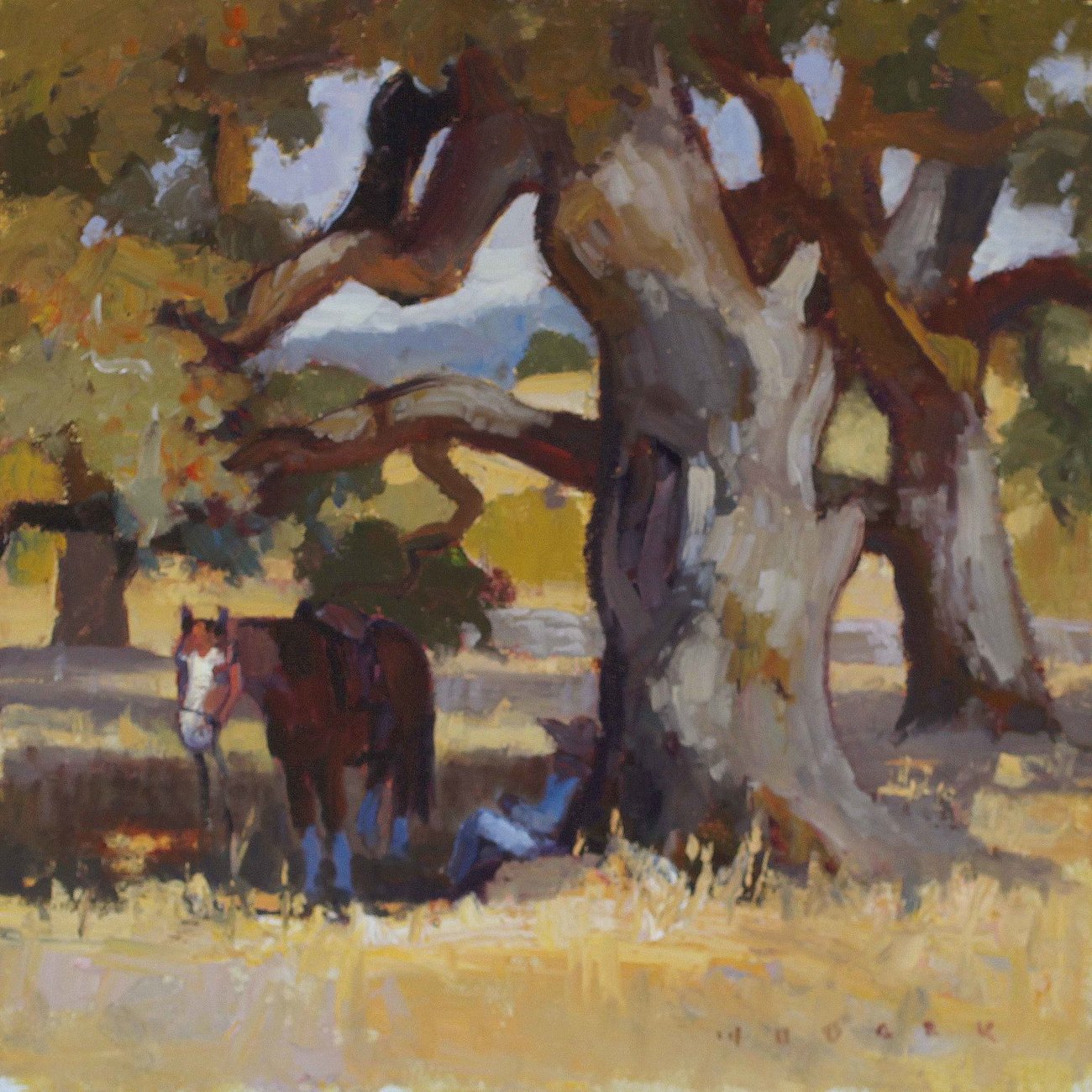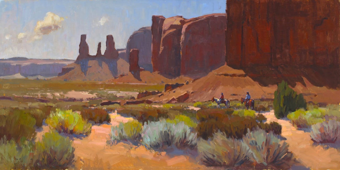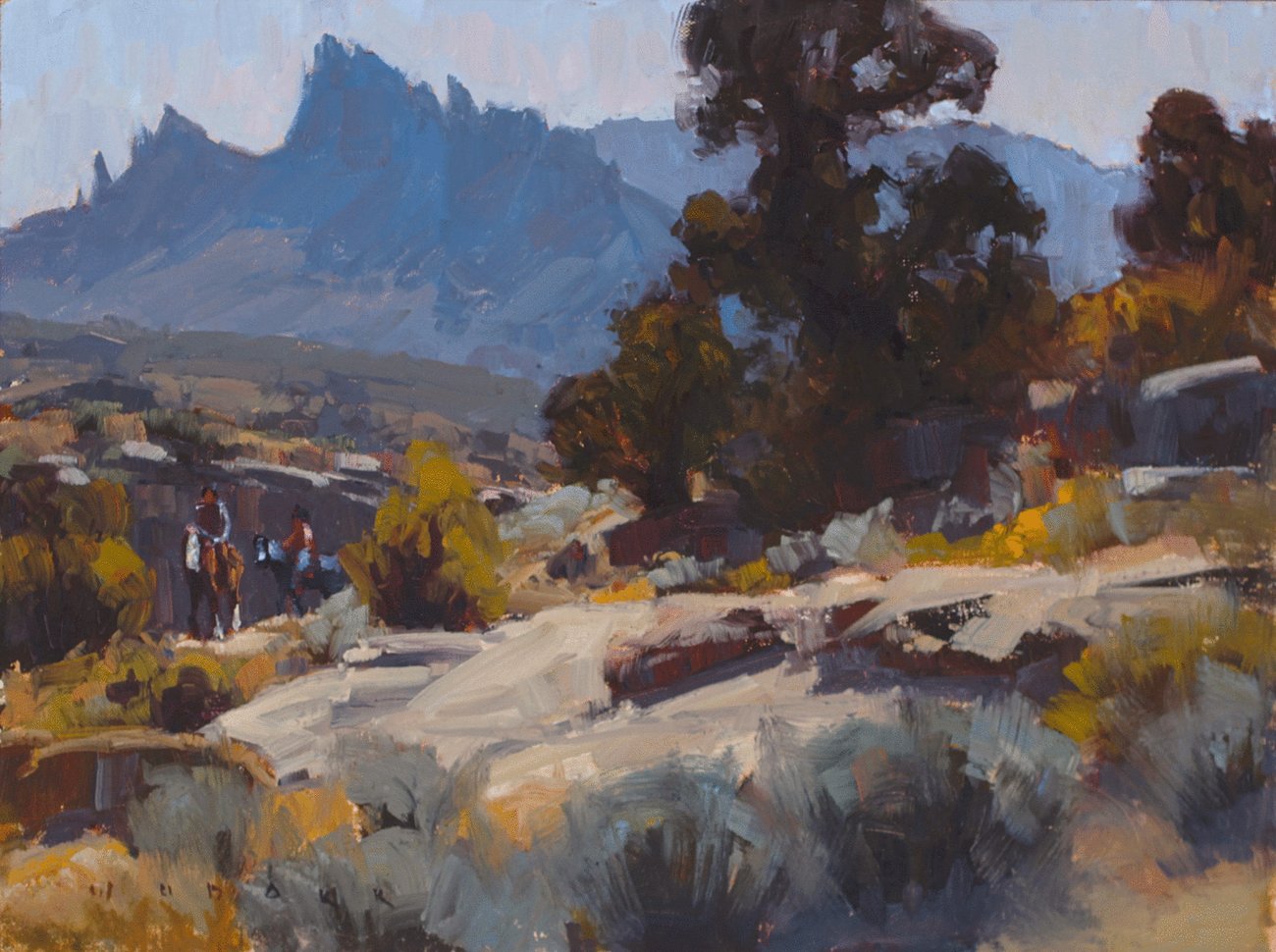Undoubtedly, it's through what Wodark calls "the tools of painting" — shapes, line, color, edges, value, and impasto — that the artist is able to convey his message with strength, eloquence, and immediacy. Of "Anasazi Trail," completed during the Zion National Park's Plein Air Invitational, Wodark says, "It's a good example of making shapes varied and interesting. There are mostly larger shapes and a few smaller ones. It gives the impression of mass in the foreground; then, as your eye moves to the left, the shapes of the riders and background become smaller. The skewed quality of the forms and their edges create dynamic diagonals, leading your eye throughout the composition. There's also a pleasing contrast of warm and cool colors, and soft and hard edges. Nothing is underdone or overworked." |  | Jim Wodark, "Anasazi Trail," 2018, oil, 12 x 16 in., Collection the artist, Plein air