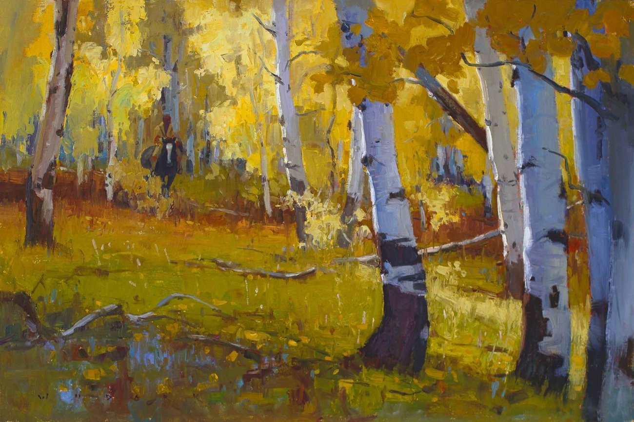 | The massing of leaf shapes and the enchanting colors in "The Golden Blanket" superbly reveal the power and clarity of the artist's voice. Again, Wodark varies the shapes, colors, and sizes of the aspen trunks and branches and the spaces between them. "This is definitely one where I felt adding a rider was essential. To see what I mean, take your hand and block out the figure and horse," he suggests. "Everything leads you to that spot, so I needed something there to reward your eye. I didn't put highlights on the rider because I didn't want you to see him at first, but rather to discover him emerging from the aspen grove."