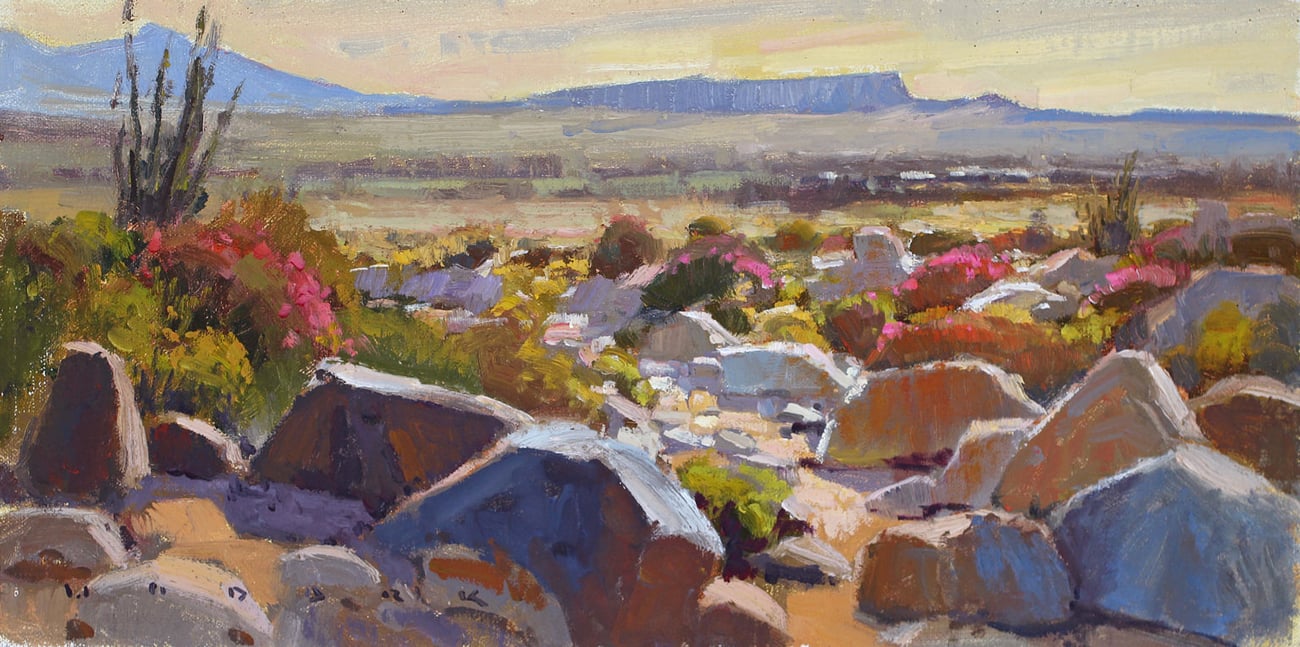 | By contrast, the artist painted the smaller "Bouncing Light" during the Anza-Borrego Desert State Park plein air invitational event, where he observed and recorded the effects of the intense Southern California desert light firsthand. The rim lighting on the backlit boulders of the arroyo fascinated the artist, as did the reflected light bouncing onto the facing sides of the rocks from the backs of those in front of them. Desert wildflowers added contrast and beauty to the elongated scene.