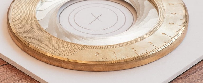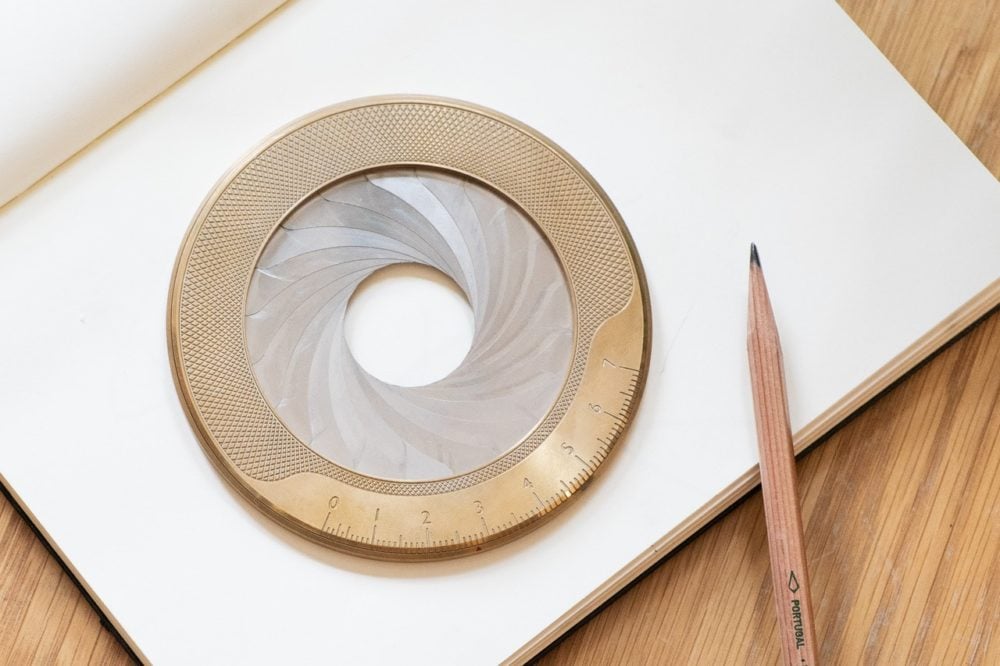 The Iris Drawing Tool is a marvel of form fitted to function. Every now and then we all have to draw a circle; now you can forget those awkward compasses that poke holes in your paper. The Iris not only makes drawing circles effortless, it makes it a genuine pleasure. |  | The solid brass and steel Iris lets you draw single, concentric, or even shaded circles with its unique moving aperture. It comes with a walnut centering tool that allows you to position your circle to a given point (like a drawing compass' needle but without the needle) and that also can be used as a display stand for the Iris when not in use.