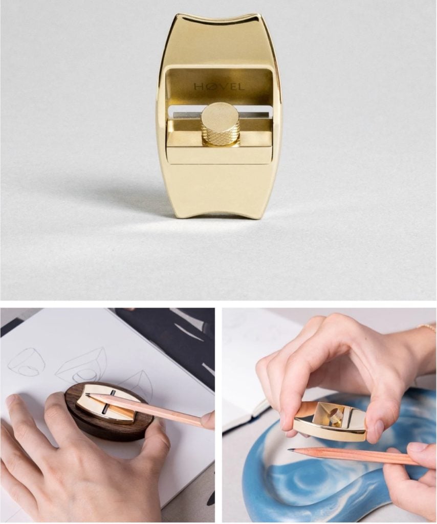 |  | While you're at it, maybe you'd like to pick up a palette too. Holbein makes some of the best. For plein air, there's a folding palette that fits neatly into a bag or backpack ($113). For the studio, there's this gorgeously curvy and larger-than-average Old School affair, available for around $165. |  | Høvel Sharpening Plane Although designed and marketed (through a kickstarter campaign) as a luxury redesigned pencil sharpener, the Høvel is a great tool for Caran deAsh crayons, pastels, oil sticks, etc., because it replaces the one-size-fits-one pencil hole with a flat, adjustable plane. This design enables you to whittle any drawing tool to any desired degree of sharpness. Say the makers, "Due to its solid brass body, its weight is a joy, and it gains beauty and character with age." This beauty will cost you $80. Ships with 10 replacement blades. A walnut base that catches shavings is sold separately. |  | Luxury Leather-Bound Sketch Books