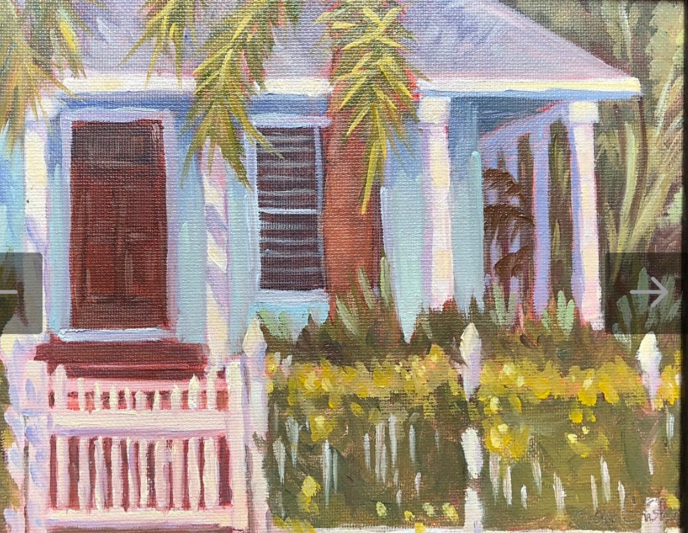 I lugged my gear down a street lined with eclectic Florida cottages, mentally testing out compositions that my skill level would allow me to successfully complete in what was now a compressed time frame, thanks to the impromptu purchase of painting supplies. Soon I spotted a pale blue Key West cottage, framed by a white picket fence and lush tropical vegetation. A friendly and accomplished artist whom I had met earlier in the year, Patricia McGuire, was already painting across the street. She had a funky Pandora mix of tunes playing in the background. The combination of music, a friendly face, and the charming old Florida scene led me to stop and set up my pochade box.