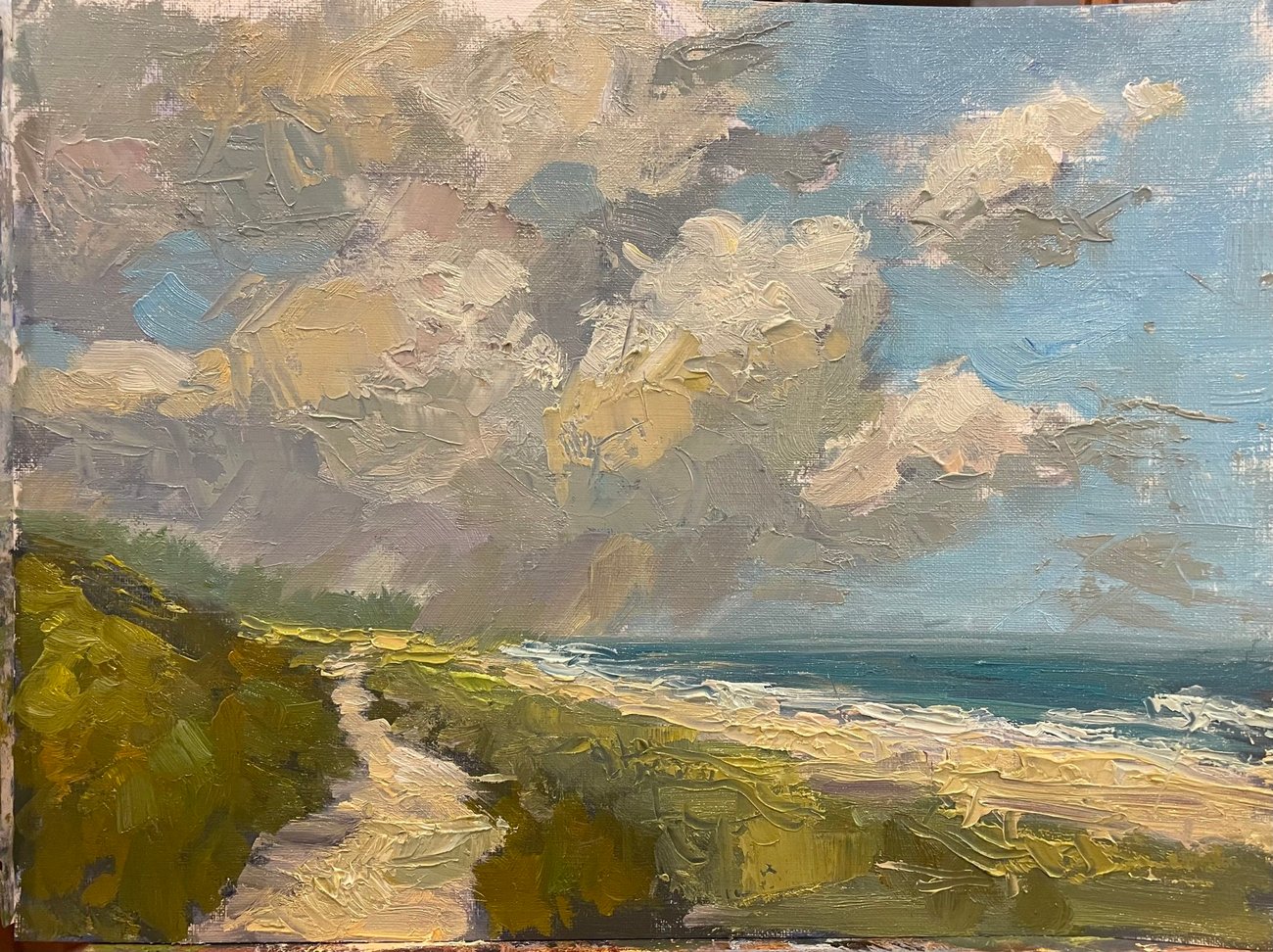 For a beginning artist, selling a painting provides much-needed validation. My dreams of becoming a better painter, a real painter, a bonafide artist suddenly seemed less foolish. |  | Sue Ginter, "Cold Front at Coral Cove," oil, 9 x 12 in. | Later I reflected on what went into selling my first painting, which had in fact been one of my written goals for the year. Initially, I had not been able to imagine how such an event might take place.