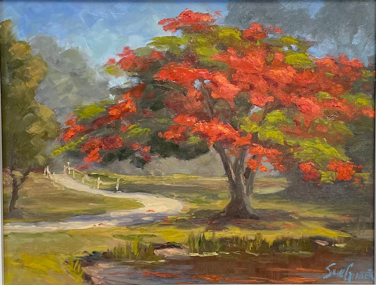First, I had to push out of my comfort zone and enter the Plein Air Fun Fest. Second, I found a way to get my hands on a canvas panel at the last minute. Third, I was open to constructive criticism from more experienced painters during the critique session. And finally, I made an inconvenient trip to the frame store so that my work could be entered into the auction. |  | Sue Ginter, "Royal Poinciana," oil, 11 x 14 in., plein air