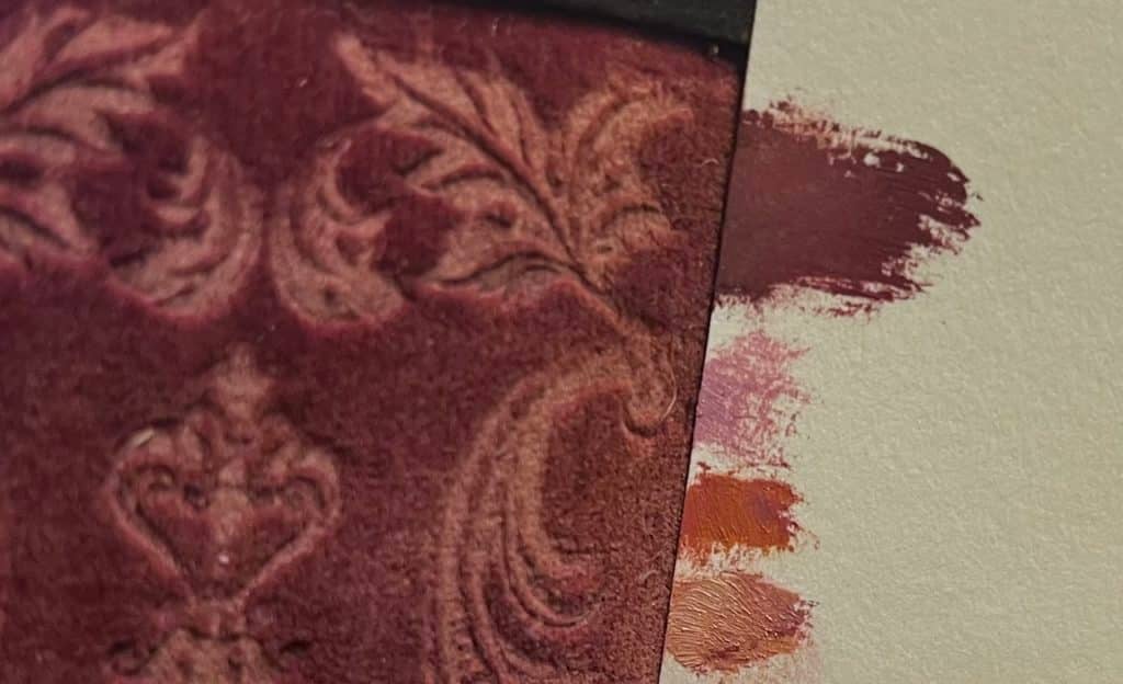 Now to get the color of the scrollwork. This is just a fancy pattern pressed into the velvet by a machine, so in theory its color is just a lighter version of the main color. But would adding white to my last mix nail it? Nope. Not at all. I have to adjust it with additions of the other colors, so I decided to just start fresh to mix this one.