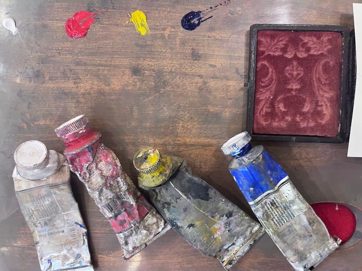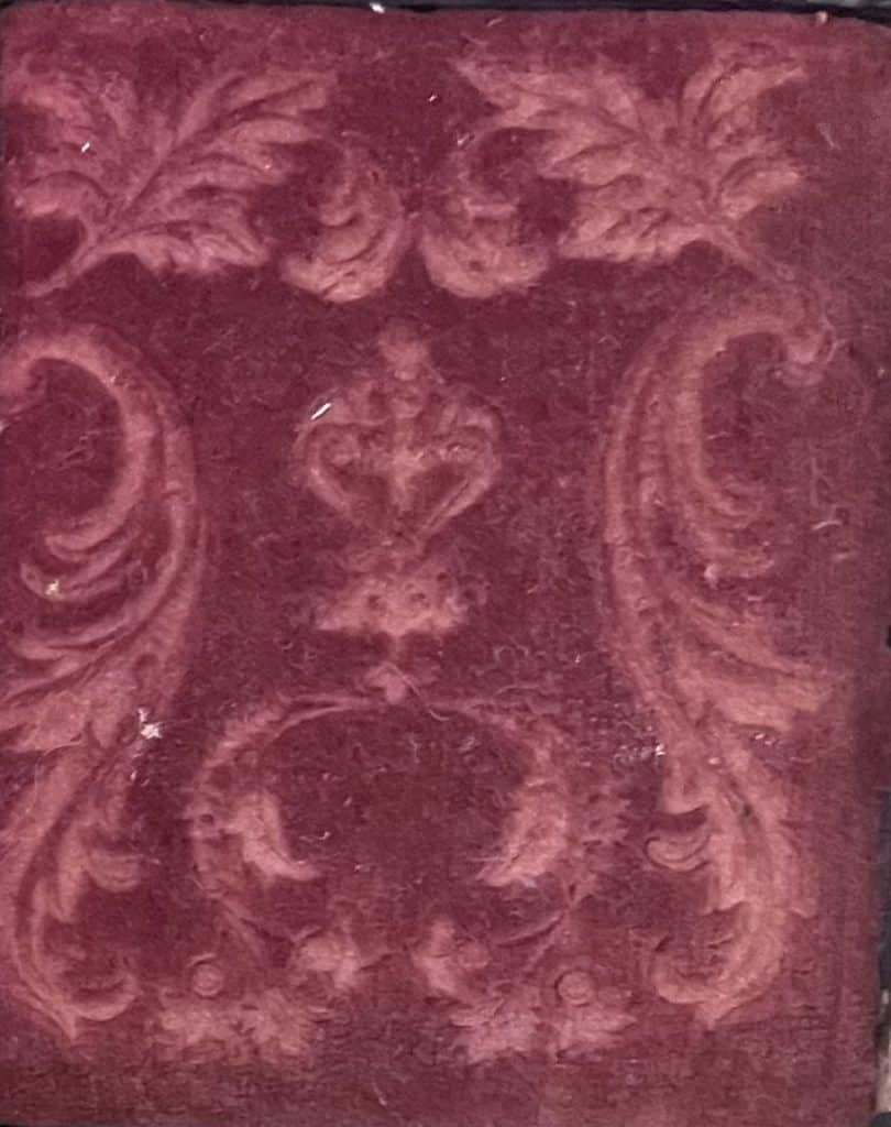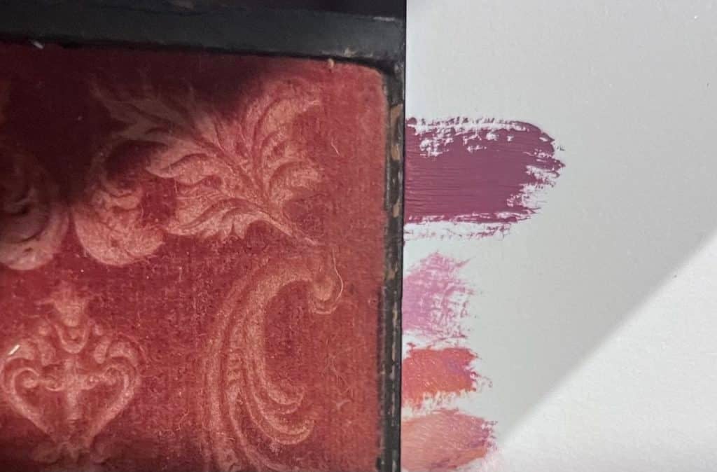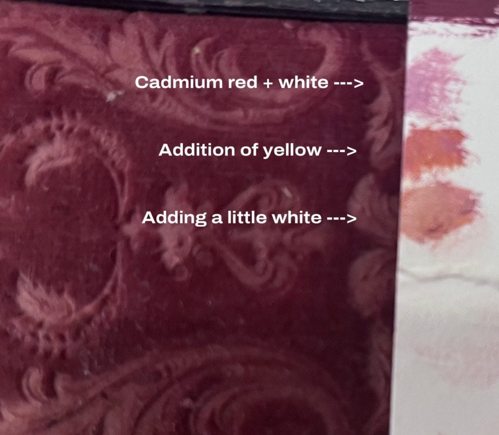 Start with the primary it's closest to. The most complex colors have SOME mix of RED, YELLOW, and/or BLUE, so pick the one you think it's nearest of the three. Force yourself to identify the hue that you see as a starting point. Say we wanted to match the two colors visible in this piece of antique velvet – the warmish mulberry color of the faded fabric itself and the lighter, indented scrollwork. |  | In this example, our weapons of choice are standard cadmium red, cadmium yellow, ultramarine blue and titanium white – so we'll start with the closest of the three, which is red. It's "too red" out of the tube of course, but it's a start.