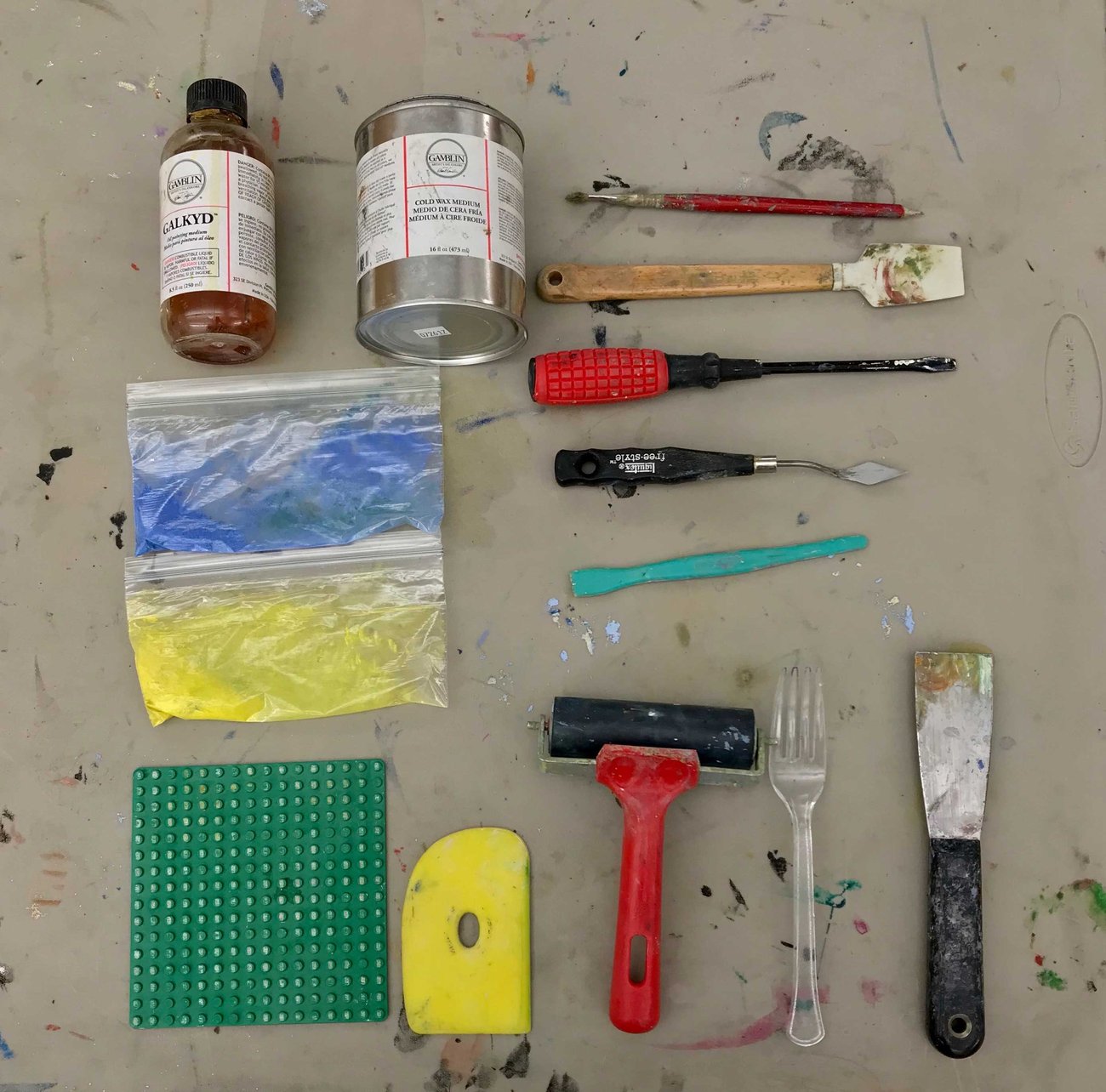 • A hard substrate works best to paint on. A panel, gesso board, or a piece of wood is great. • Get some cold wax medium. You can go to your local art store or order online. • Go to a hardware store and kitchen store. Yes . . . cold wax medium is more fun with spatulas, brayers, cake bowl scrapers, pottery ribs, screwdrivers, forks, and squeegees. If you use brushes . . . use old ones with character. • Pick some paint for your palette, grab some dry pigment or crushed up charcoal. • Have some odorless mineral spirits handy.