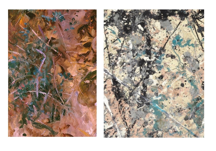 In the following close-up you can see that the surface of the painting has more than just the "unfinished" sketch-like quality of an Impressionist painting. Rather, he uses every mark expressively. Each stroke contributes a line or a mass that nominally delineates a branch, a leaf, or a root but primarily contributes to the overall feeling he wants to express. |  | Detail: John Singer Sargent, Veldemosa, Majorca: Thistles and Herbage on a Hillside (1908) | This is just loose painting; it's wizardry! Anyway, it's a kind of feeling-first painting … these lines and edges are intentionally energetic. Sargent makes himself a conduit for the haphazard energy inherent in natural design. Jackson Pollock was the painter who took this idea to its logical conclusion.Here's a comparison. On the left is a detail from Sargent's Majorca painting. On the right is a detail from Pollock's Lavender Mist, also in the National Gallery. |  | Both employ a dense web of lines and points atop a molten flow of soft-edged color-shapes. The real main difference, as I see it, is that Sargent is also using modified forms and colors of nature, whereas Pollock dispenses with the representational aspect completely in order to maximize the expressive qualities of the medium itself. "I want to express my feelings rather than illustrate them," he said in 1947. Why would you want to copy or make pictures of nature, he felt, if you could channel its forces directly onto the canvas?
