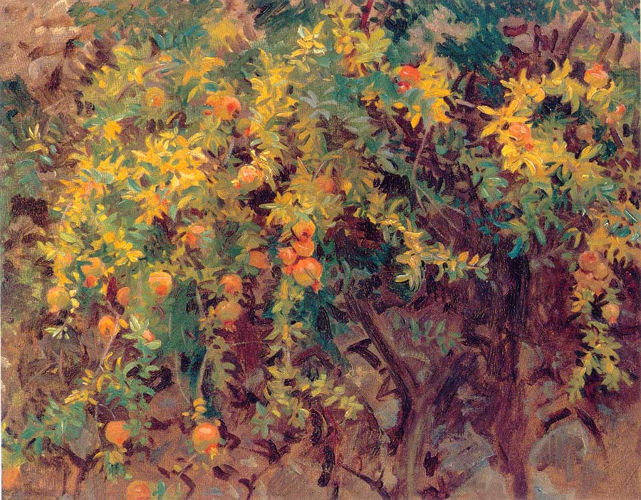 The paintings are the traces of a spirit set free. They work exceptionally well, I think, because of the unfussy brushwork and tropical color paired with interesting and original underlying abstract design. It seems that in his quick plein air studies, his brush was most vigorous and unguarded. His quickened sense of freedom and the brilliant, thriving pulse of natural life on the island encouraged an unfettered informality not present in his salon pictures or formal portraits. |  | John Singer Sargent, Pomegranates, Majorca (1908) | In the painting above titled Pomegranates, Majorca (1908), Sargent celebrates the explosion of warm leaves and ripe fruit glowing against the deeper shades of the tree limbs and sandy soil. I like to think he sometimes chose the palette for these paintings to match at once the earthiness and the airy sea-light of the island. In the second Pomegranates study below, the fruits are so ripe they're erupting, spilling clotted flows like lava from their rinds.